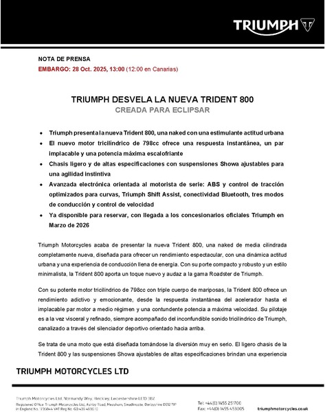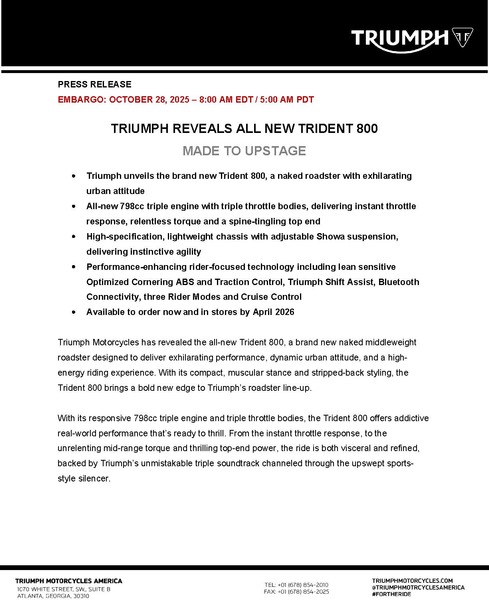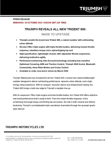 Customers in the UK can configure and reserve their new Trident 800 online, using Triumph’s new Reserve My Triumph technology. Securing their preferred colour with a deposit via their preferred dealer, customers can ensure they are one of the first to collect their new bike. The new bike reservation service will be progressively introduced across Europe and other major markets from Spring 2026.