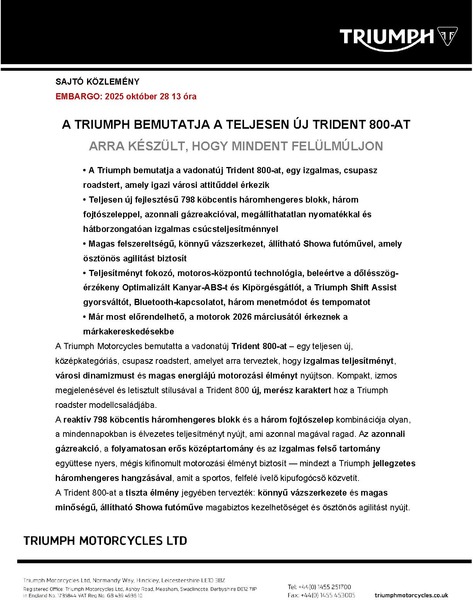 Steve Sargent, Chief Product Officer, Triumph Motorcycles said: “The incredible popularity of the Trident 660 and the Street Triple 765 RS has shown us just how much riders in this segment value a thrilling, confidence-inspiring ride that’s packed with character and technology. With the launch of the Trident 800, we’ve taken that winning formula and dialled it up, delivering even more road-focused capability and excitement.