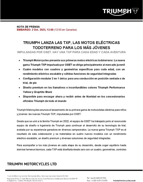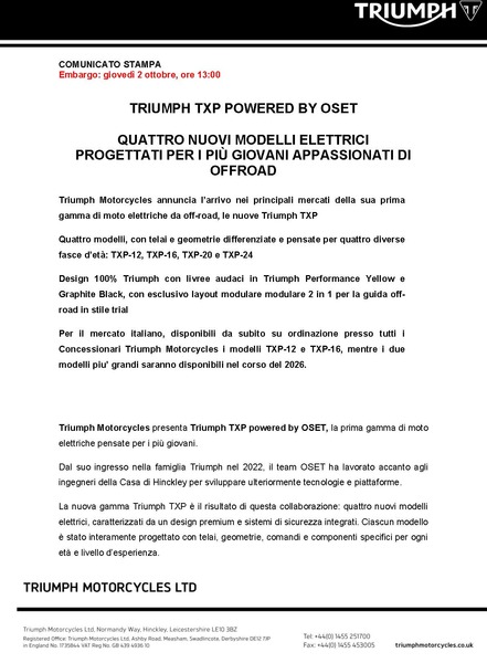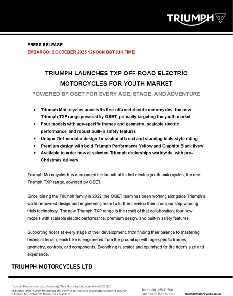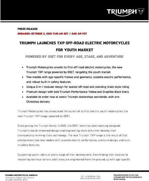 - Triumph Motorcycles unveils its first off-road electric motorcycles, the new Triumph TXP range powered by OSET, primarily targeting the youth market