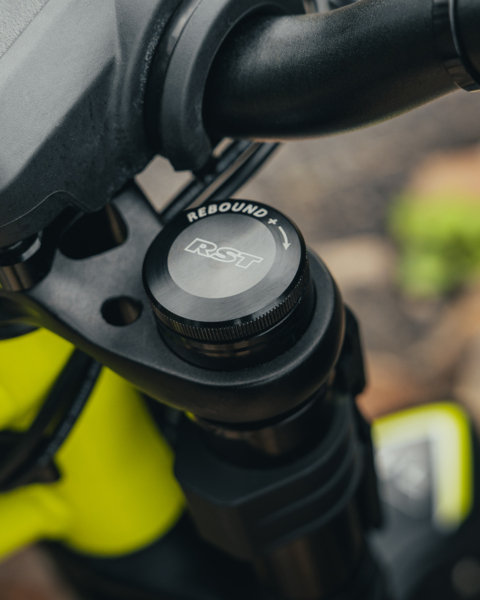 With its lightweight steel frame, the TXP-12 is just 22.7kg in Trials set up, making it easy to lift, manoeuvre, and control. Its low seat height, just 360mm in Trials mode, and 445mm in Explore mode, allows young riders to plant both feet firmly on the ground, while child-sized grips and short-reach brake levers ensure comfortable operation. The compact chassis has a 675mm wheelbase, 152mm ground clearance, and low 650mm handlebar height, creating balance and low-speed stability for small riders. The TXP-12 features a 50mm front fork, plus a 60mm coil rear shock with rebound and preload adjustability for growing riders.