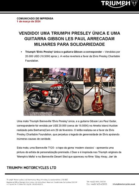 Dana Carpenter, Executive Vice President, Entertainment at Authentic Brands Group, owner of Elvis Presley Enterprises added: "We are excited to partner with an iconic brand like Triumph to bring this one-of-a-kind custom Bonneville T120 to life while benefiting one of Elvis' favorite charities. The added generosity of our friends at Gibson for contributing a matching custom Les Paul guitar, strengthens the legacy of generosity and community that Elvis Presley stood for."