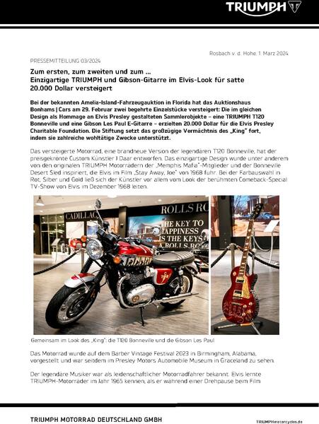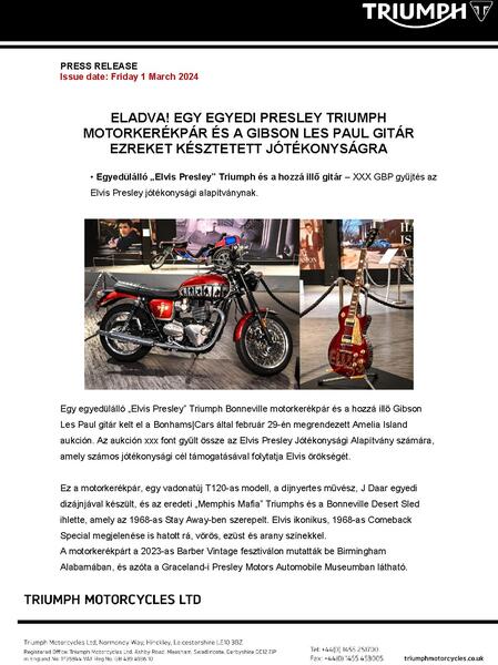 "This lot has clearly been a huge hit with Elvis and motorcycle fans, raising a fantastic figure for good causes,” said Paul Stroud, Chief Commercial Officer, Triumph Motorcycles. "The T120 and the Gibson guitar look, featuring custom designs by J Daar, look so distinctive and they are a wonderful tribute to the legend."