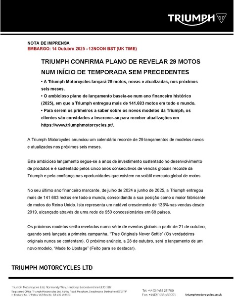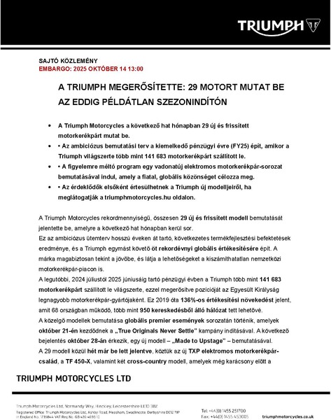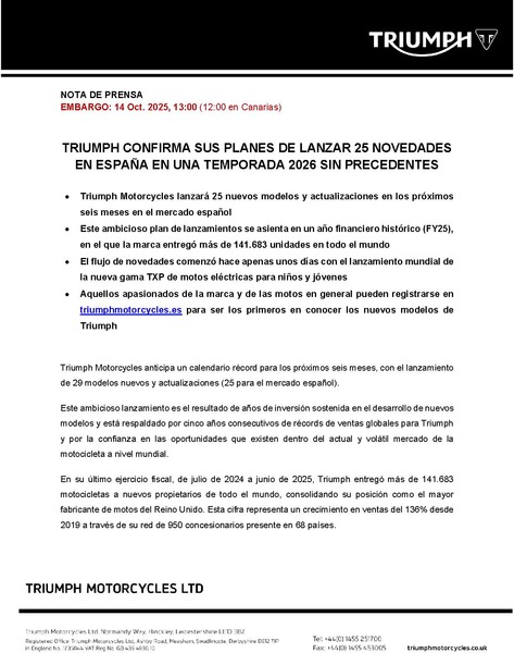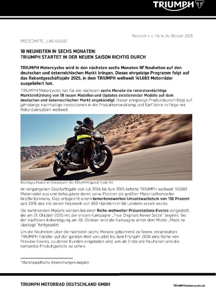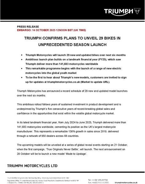 - Ambitious launch plan builds on a landmark financial year (FY25), which saw Triumph deliver more than 141,683 motorcycles worldwide
