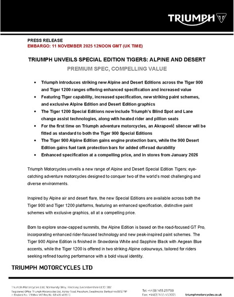 TRIUMPH UNVEILS SPECIAL EDITION TIGERS: ALPINE AND DESERT - PREMIUM SPEC, COMPELLING VALUE