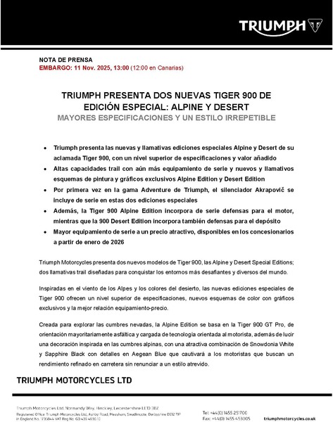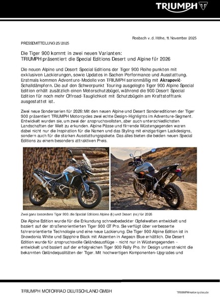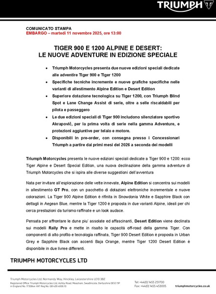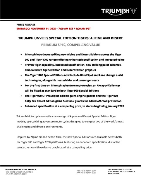 - Triumph introduces striking new Alpine and Desert Editions across the Tiger 900 and Tiger 1200 ranges offering enhanced specification and increased value